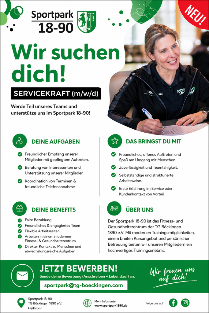 Du bist freundlich, zuverlässig und hast Freude am Umgang mit Menschen? Dann werde Teil unseres Teams im Sportpark 18-90 – dem Fitness- und Gesundheitszentrum der TG Böckingen 1890 e.V.